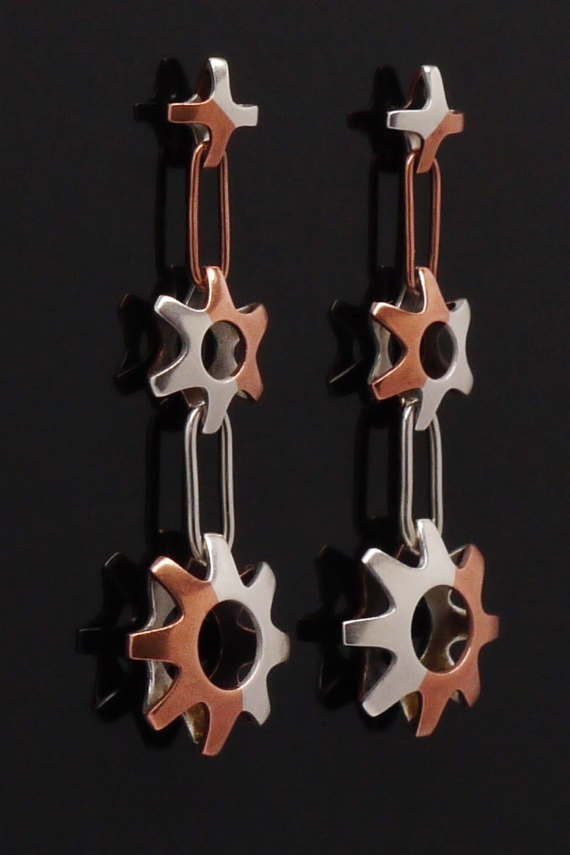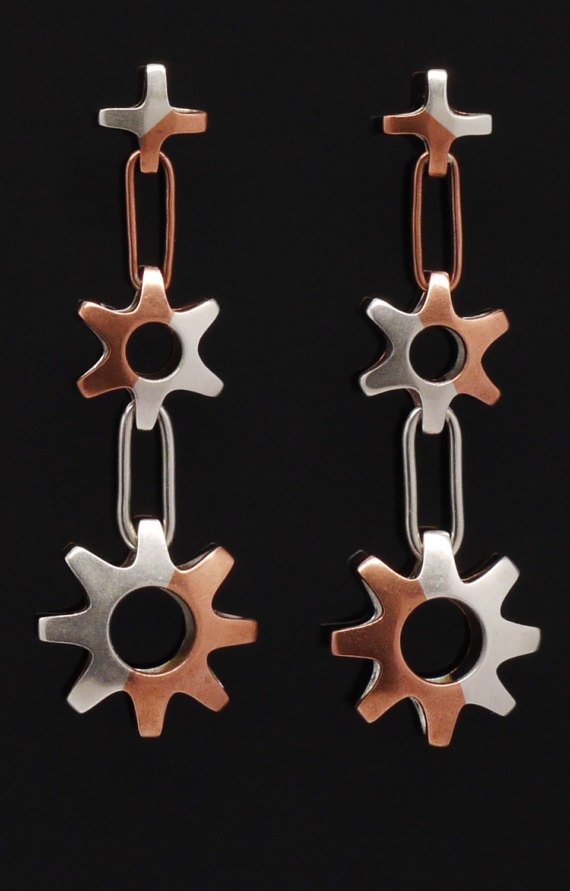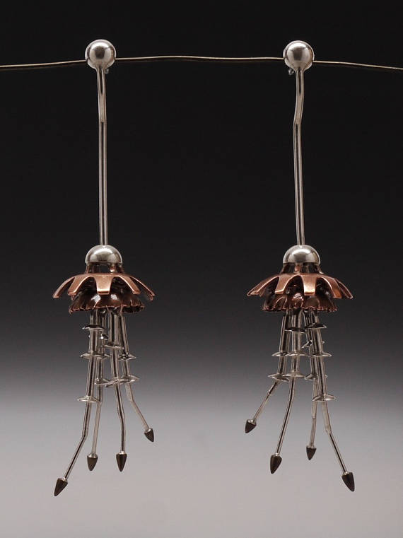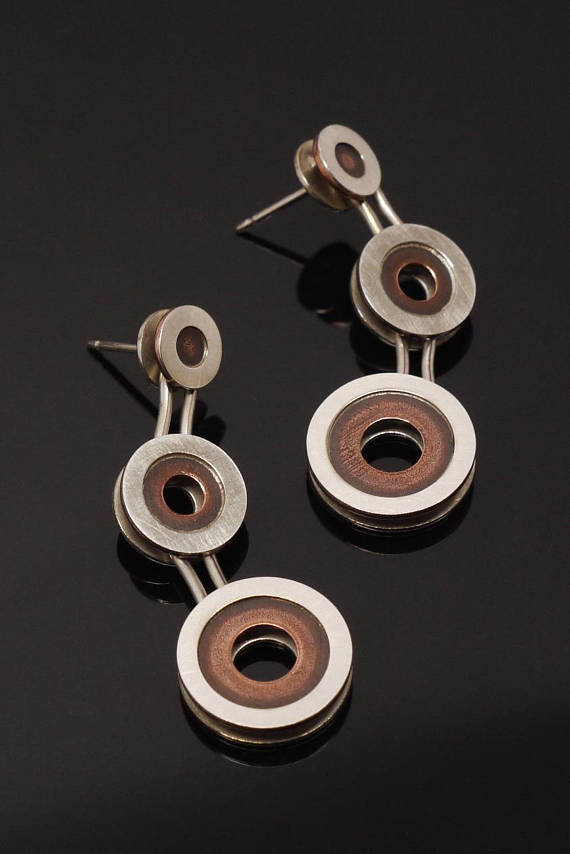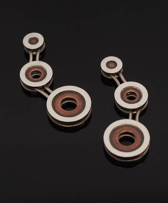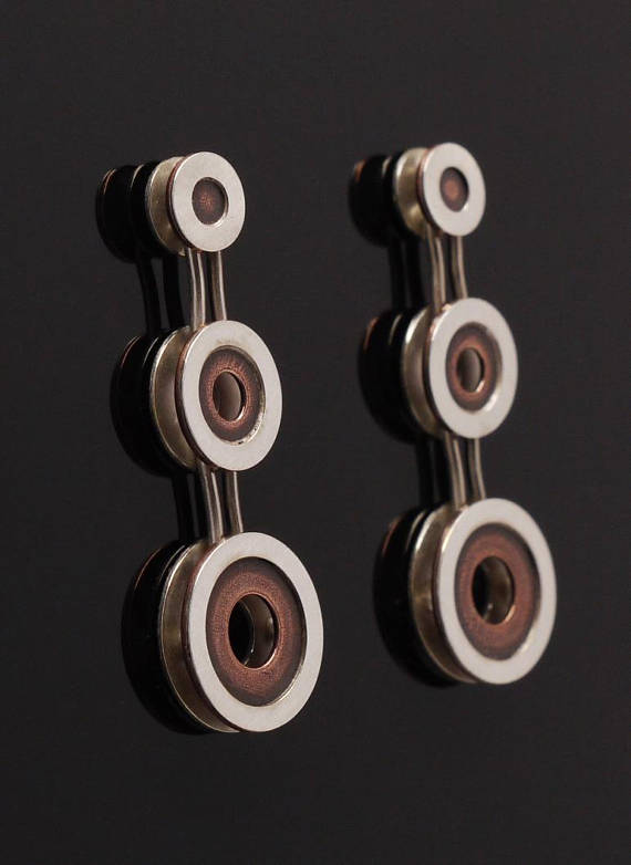 1 1/2 in. long with three progressively larger discs. Each is made from sterling silver and copper rings.
