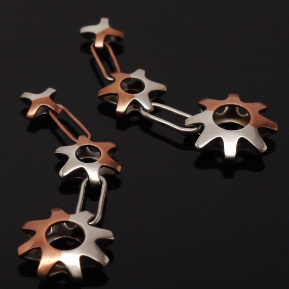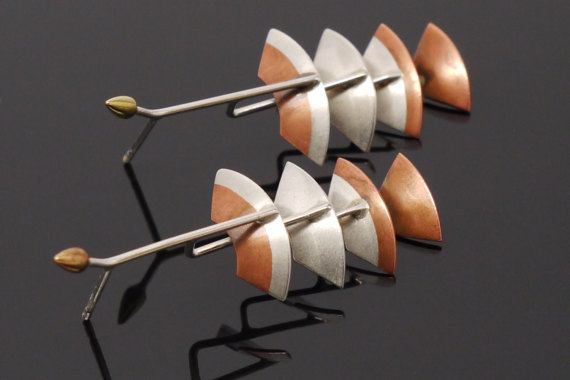 1 1/2 in. long with three progressively larger shapes. The alternating copper and sterling silver pattern flows from top to bottom.