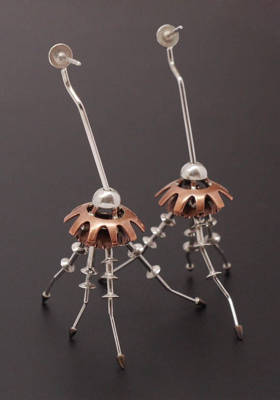 2 1/4 in. long from the post at the top to the longest brass tipped tentacle. Each earring is six connected pieces which allows them to swivel and oscillate.